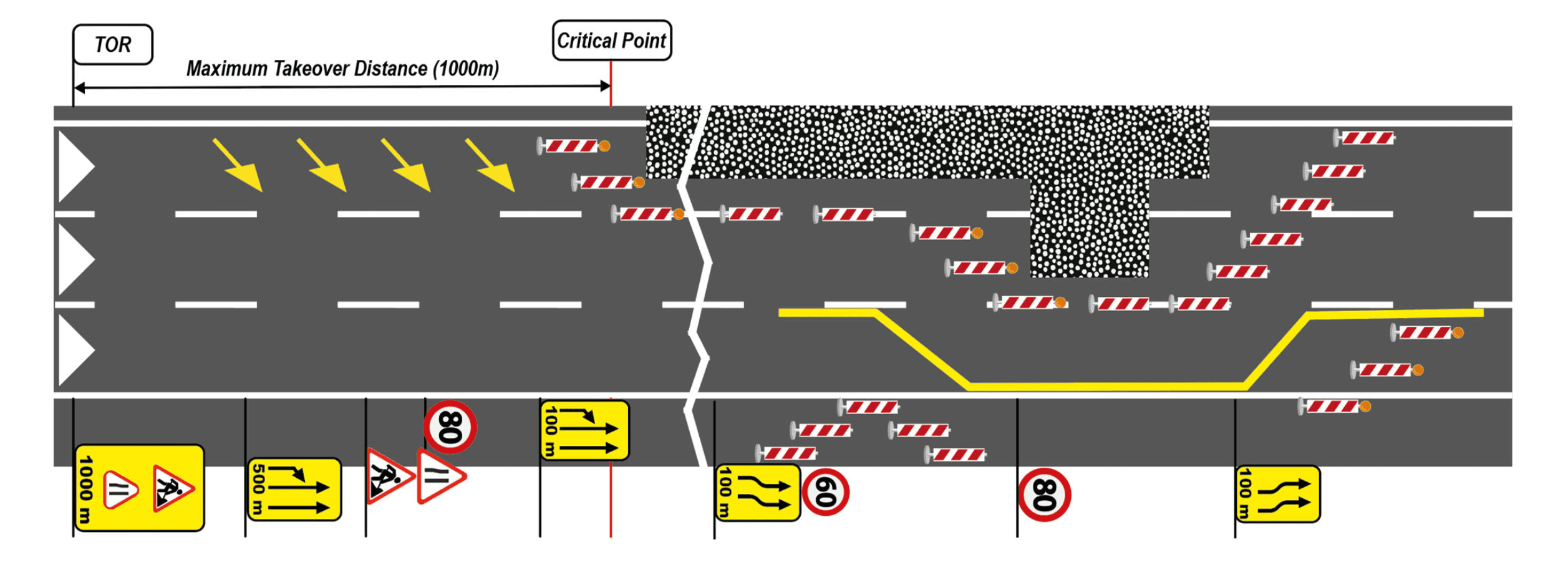 Figure 3: Road construction layout applied throughout the study. Source: Nagy, V., da Luz, D. M., Sándor, Á. P., & Borsos, A. (2024). Evaluation of Autonomous Vehicle Takeover Performance in Work-Zone Environment. Engineering Proceedings, 79(1), 59.