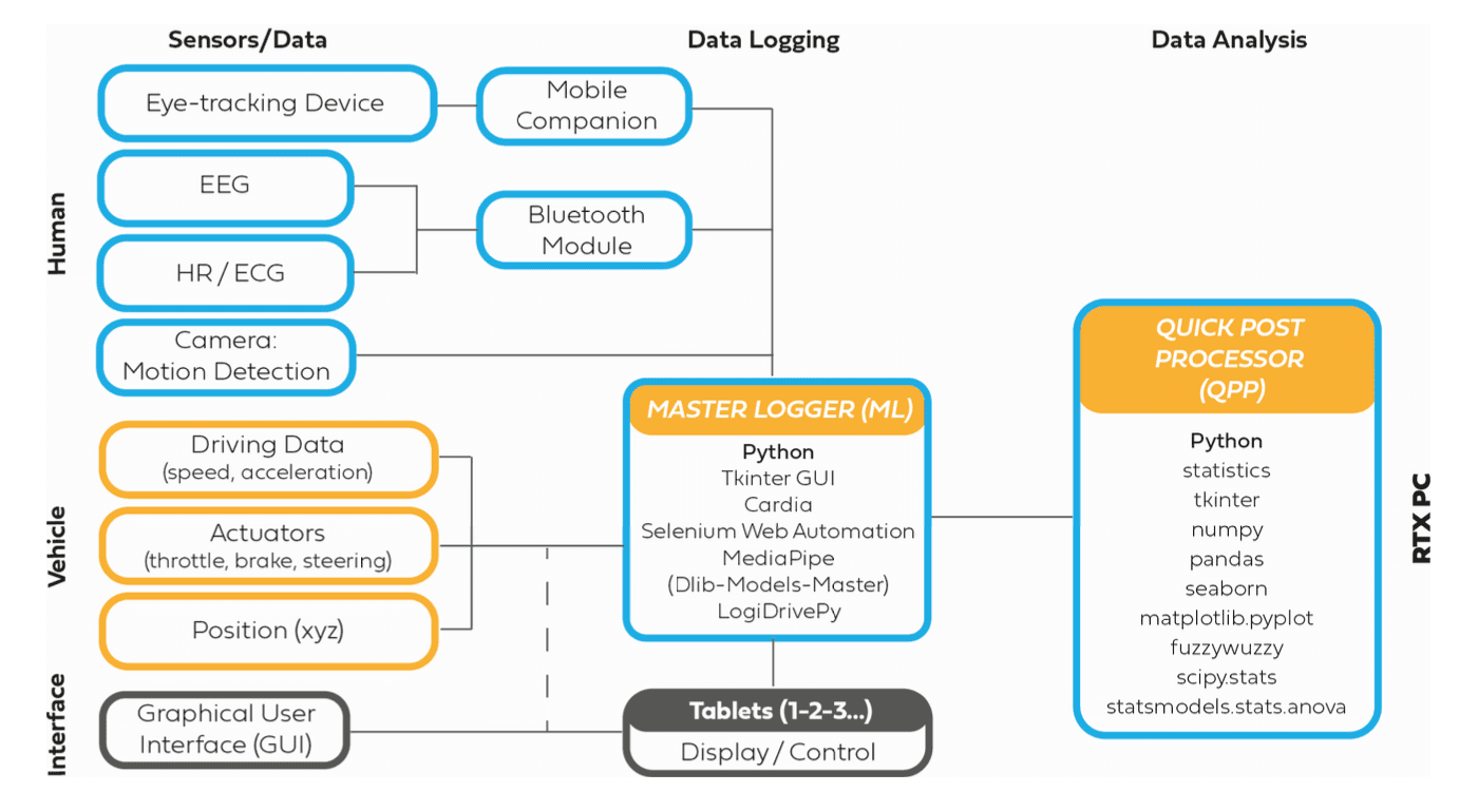 To this end, Sándor and Nagy developed a modular framework called the Automatized Driving Data Analyzer (ADDA). This system acts as a central hub, synchronizing real-time data from Neon (gaze), Polar sensors (heart rate), and vehicle simulators (BeamNG).