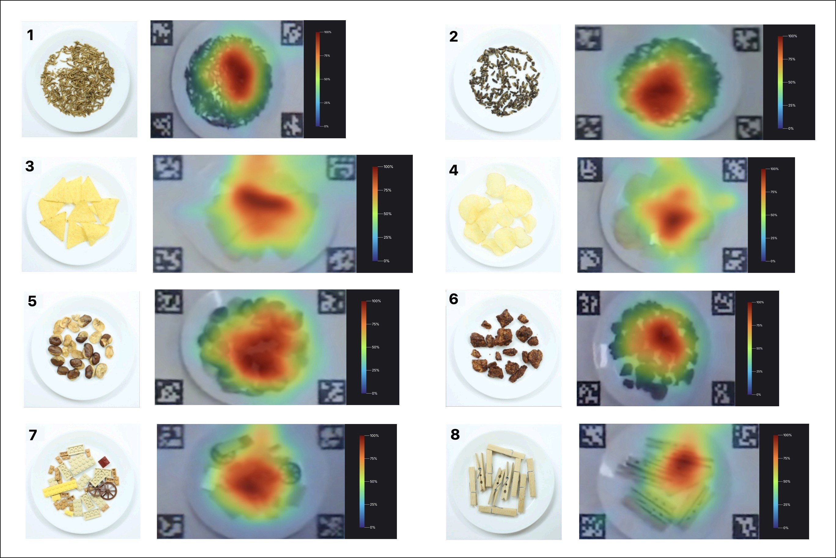 Figure 1: Fixation heatmaps showing visual attention to different items displayed on the buffet: (1) mealworms, (2) crickets, (3) tortilla chips, (4) crisps, (5) roasted broad beans, (6) Wah-Yuen fried dough, (7) Lego bricks, and (8) cloth pegs. Image adapted from Potthoff, J., Gumussoy, M., Schienle, A., & Dalmaijer, E. S. (2025). Curious yet disgusted: A mobile eye-tracking investigation of visual attention to insect-based snacks in a buffet setting. Food Quality and Preference, 105826 and additional materials provided by the authors.
